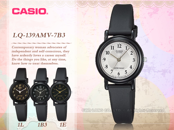 CASIO推出指針女錶LQ-139AMV系列,採用黑色系樹脂錶帶設計,錶面設計簡單且直覺易讀,兼具外型與實用性。