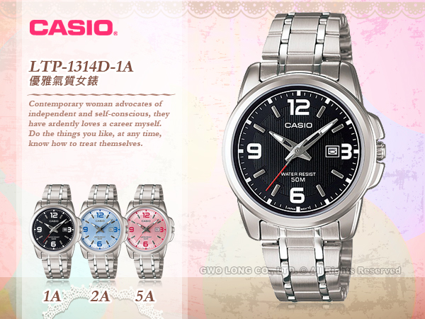 LTP-1314D以經典圓弧造型設計,粉色錶面隨著光線折射閃耀獨特光芒,搭配銀色的立體刻度以及指針及日期顯示窗,簡潔俐落的設計,輕鬆展現出眾的風采自我。