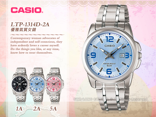 LTP-1314D以經典圓弧造型設計,粉色錶面隨著光線折射閃耀獨特光芒,搭配銀色的立體刻度以及指針及日期顯示窗,簡潔俐落的設計,輕鬆展現出眾的風采自我。
