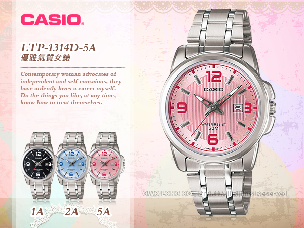 LTP-1314D以經典圓弧造型設計,粉色錶面隨著光線折射閃耀獨特光芒,搭配銀色的立體刻度以及指針及日期顯示窗,簡潔俐落的設計,輕鬆展現出眾的風采自我。