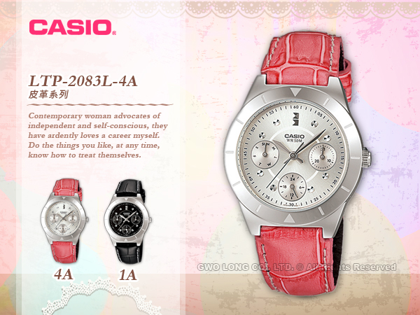 LTP-2083L-4A CASIO 指針錶 皮革錶帶 防水50米 礦物玻璃 日期顯示