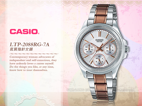 LTP-2088RG-7A CASIO 指針錶 不鏽鋼錶帶 防水50米 礦物玻璃 日期星期顯示