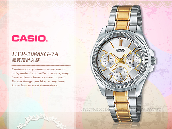 LTP-2088SG-7A CASIO 指針錶 不鏽鋼錶帶 防水50米 礦物玻璃 日期星期顯示
