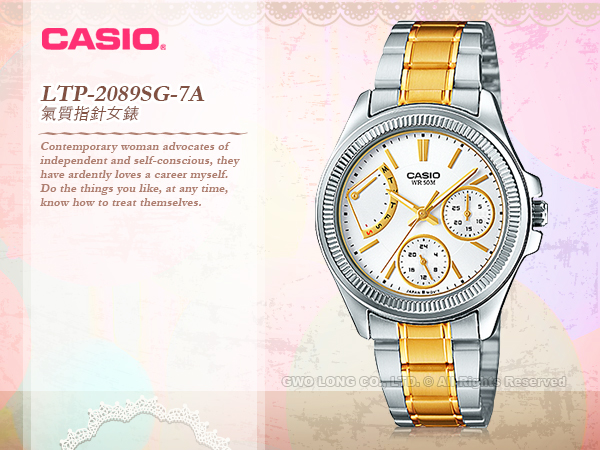 LTP-2089SG-7A CASIO 指針錶 不鏽鋼錶帶 生活防水 礦物玻璃 日期星期顯示