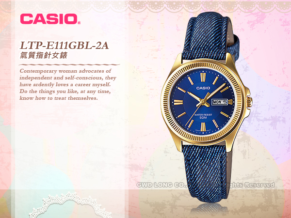 LTP-E111GBL-2A CASIO 指針錶 皮革錶帶 生活防水 礦物玻璃 日期星期顯示