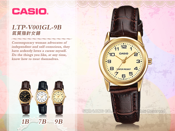 LTP-V001GL-9B CASIO 指針錶 皮革錶帶 生活防水 礦物玻璃