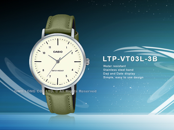 LTP-VT03L-3B CASIO 簡約指針女錶 皮革錶帶 橄欖綠 生活防水 LTP-VT03L