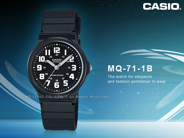 CASIO男性樹脂錶帶指針錶MQ-71系列,以沉穩的黑色為主色調,錶盤搭配搶點的白、水藍和亮橘的阿拉伯數字整點時刻,讓視覺閱讀上易於判讀,採用服貼且輕量的樹脂錶帶,佩戴上更為舒適,並搭配生活防水,日常生活的下雨、洗手也不必擔心。