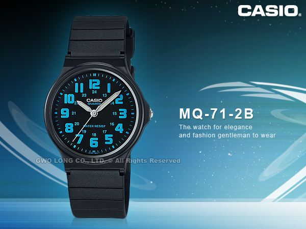 CASIO男性樹脂錶帶指針錶MQ-71系列,以沉穩的黑色為主色調,錶盤搭配搶點的白、水藍和亮橘的阿拉伯數字整點時刻,讓視覺閱讀上易於判讀,採用服貼且輕量的樹脂錶帶,佩戴上更為舒適,並搭配生活防水,日常生活的下雨、洗手也不必擔心。