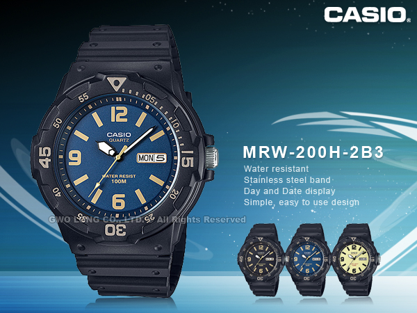 MRW-200H-2B3 CASIO 指針錶 橡膠錶帶 100米防水 星期 日期顯示