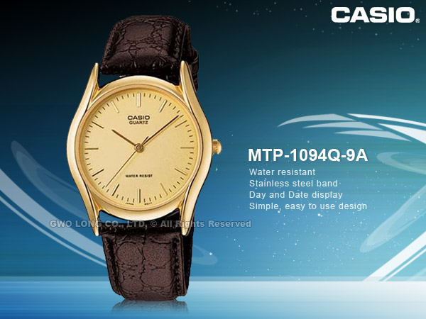MTP-1094Q-9A CASIO 指針錶 皮革錶帶 礦物玻璃 生活防水