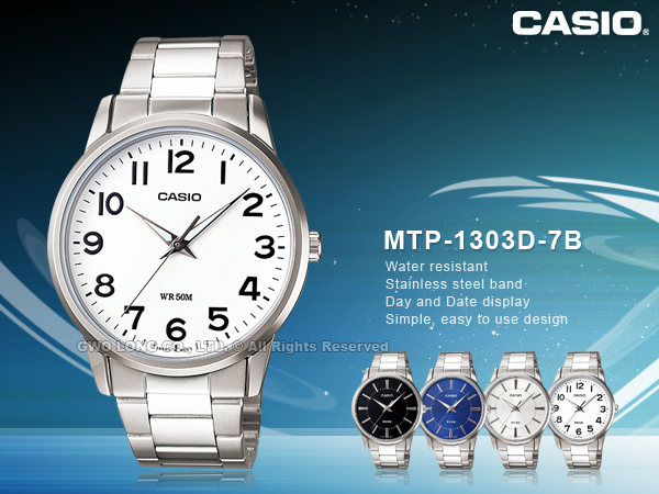 MTP-1303D-7B CASIO 指針錶 不鏽鋼錶帶 50米防水 礦物玻璃