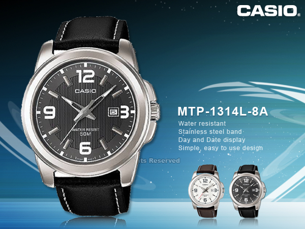 MTP-1314L-8A CASIO 指針錶 皮革錶帶 礦物玻璃 防水50米 日期顯示
