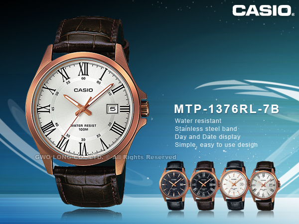 MTP-1376RL-7B CASIO 指針錶 皮革錶帶 生活防水 礦物玻璃 日期顯示