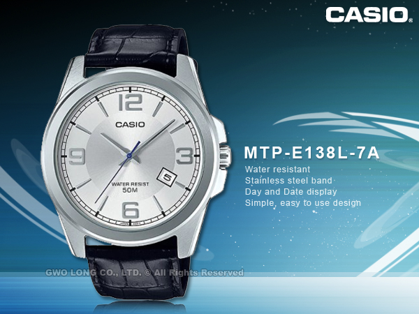 MTP-E138L-7A CASIO 指針錶 皮革錶帶 防水50米 礦物玻璃 日期顯示