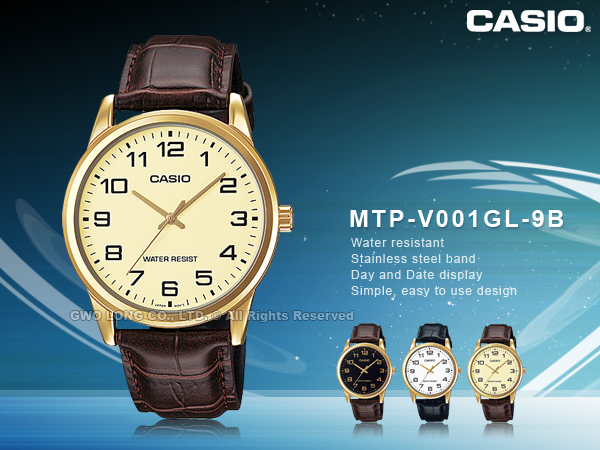 MTP-V001GL-9B CASIO 指針錶 皮革錶帶 生活防水 礦物玻璃