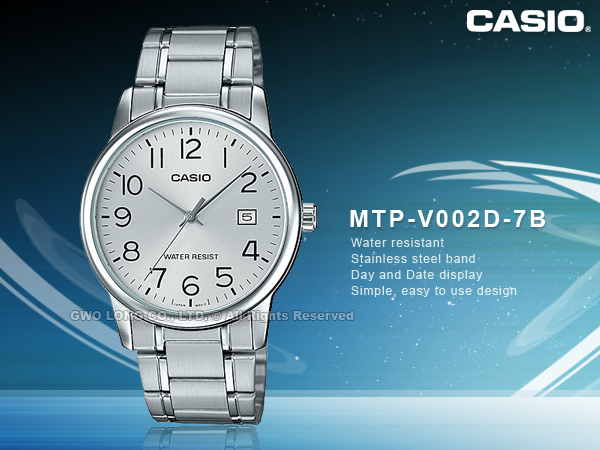 MTP-V002D-7B CASIO 指針錶 不鏽鋼錶帶 生活防水 礦物玻璃