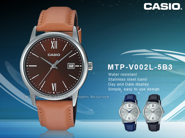 MTP-V002L-5B3 CASIO 指針錶 皮革錶帶 生活防水 礦物玻璃 MTP-V002L