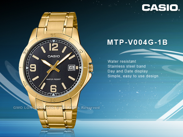 MTP-V004G-1B CASIO 簡約時尚指針錶 金色 不鏽鋼錶帶 日常生活防水