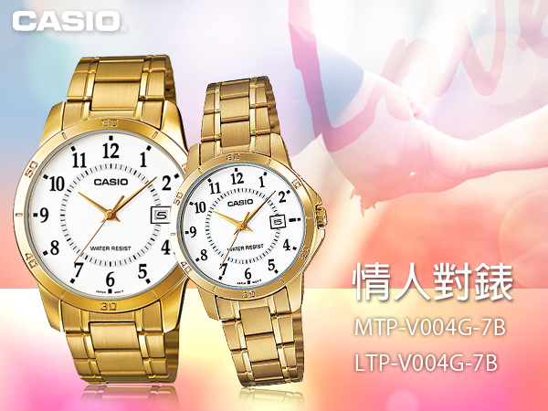 MTP-V004G-7B + LTP-V004G-7B CASIO 甜蜜情侶指針石英錶 不鏽鋼錶帶 日常生活防水 日期顯示