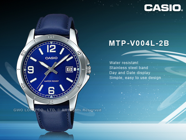 MTP-V004L-2B CASIO 簡約指針石英錶 皮革錶帶 日常生活防水 日期顯示