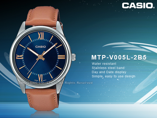 MTP-V005L-2B5 CASIO 指針錶 皮革錶帶 藍 生活防水 礦物玻璃 MTP-V005L