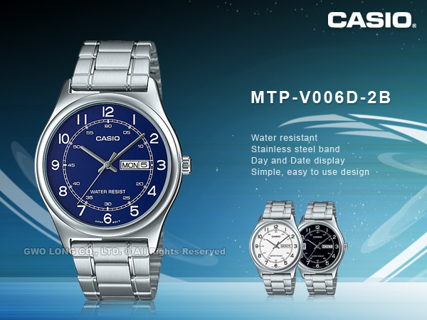 MTP-V006D-2B CASIO 簡約指針石英錶 不鏽鋼錶帶 生活防水 星期及日期顯示