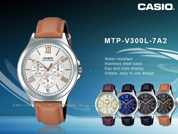 MTP-V300L-7A2 CASIO 羅馬三眼指針男錶 皮革錶帶 銀白色 生活防水