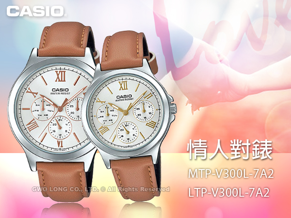 MTP-V300L-7A2+LTP-V300L-7A2 CASIO 三眼指針情侶對錶 皮革錶帶 生活防水