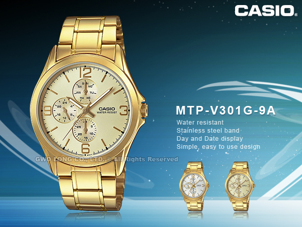 MTP-V301G-9A CASIO 指針錶 不鏽鋼錶帶 生活防水 礦物玻璃