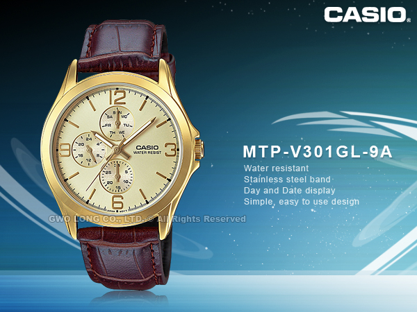 MTP-V301GL-9A CASIO 指針錶 皮革錶帶 生活防水 礦物玻璃