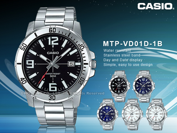 MTP-VD01D-1B CASIO 指針錶 不鏽鋼錶帶 礦物玻璃 防水50米 日期顯示