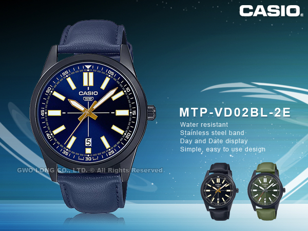 MTP-VD02BL-2E CASIO 指針男錶 皮革錶帶 生活防水 日期顯示 MTP-VD02BL