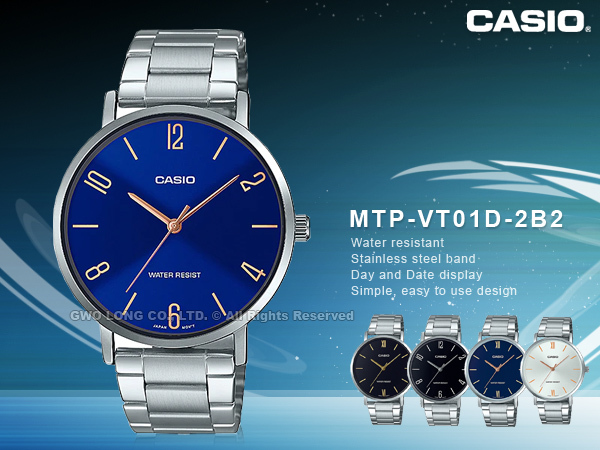 MTP-VT01D-2B2 CASIO 簡約丁字時尚男錶 不鏽鋼錶帶 藍色錶面 日常生活防水 MTP-VT01D