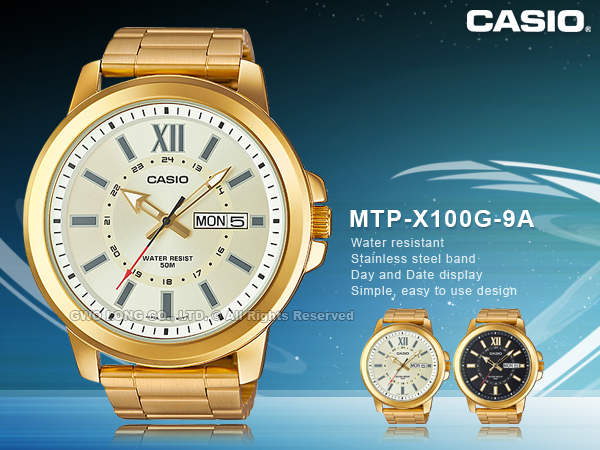MTP-X100G-9A CASIO 指針男錶 不鏽鋼錶帶 金色 防水