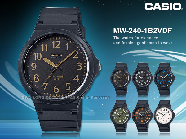 CASIO推出簡約指針式系列錶款-MW-240,簡單乾淨的錶盤設計,搭配清楚的數字時刻,以黑色樹脂錶帶搭配撞色錶盤設計,共推出6種配色黑x棕、黑x白、黑x藍、綠x白、黑x橘、白x黑。