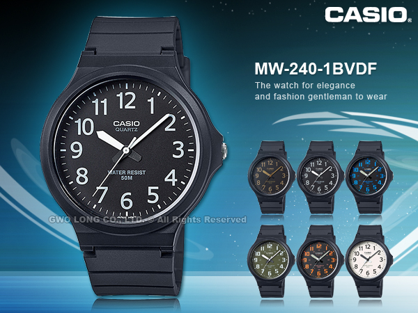 CASIO推出簡約指針式系列錶款-MW-240,簡單乾淨的錶盤設計,搭配清楚的數字時刻,以黑色樹脂錶帶搭配撞色錶盤設計,共推出6種配色黑x棕、黑x白、黑x藍、綠x白、黑x橘、白x黑。