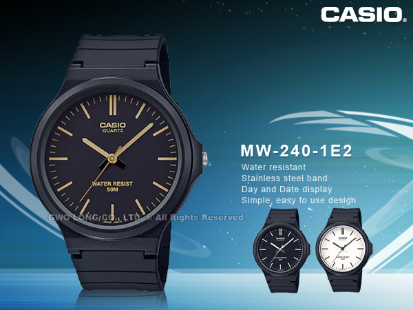 MW-240-1E2 CASIO 簡約指針錶 樹脂錶帶 黑x金 防水50米
