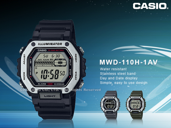 MWD-110H-1A CASIO 數位男錶 強悍金屬 膠質錶帶 LED照明 鬧鈴 防水100米 MWD-100H