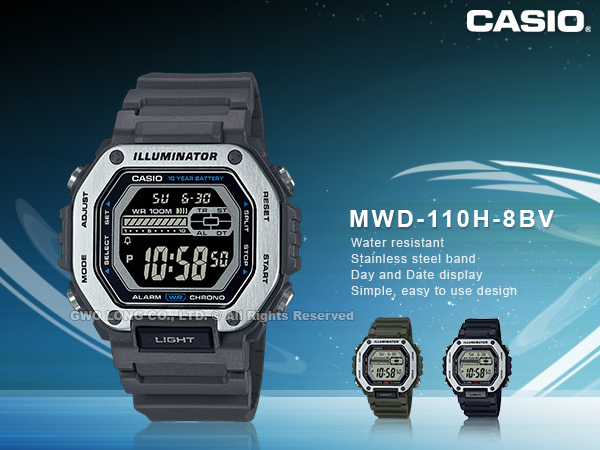 MWD-110H-8B CASIO 數位男錶 強悍金屬 鐵灰色 膠質錶帶 LED照明 防水100米 MWD-100H