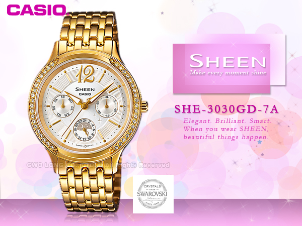 SHE-3030GD-7A CASIO SHEEN 女錶 不鏽鋼錶帶 白面 防水 礦石玻璃 施華洛世奇