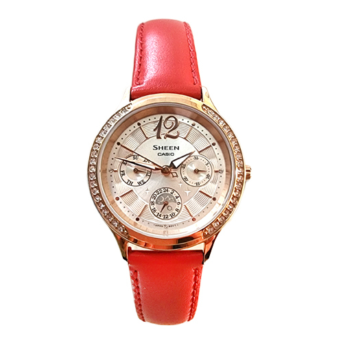 SHE-3030GL-9A CASIO SHEEN 女錶 紅色錶帶 皮革錶帶 玫瑰金 三眼 防水 施華洛世奇