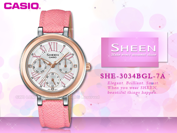 SHEEN 2017春夏推出以粉嫩色系為主題的全新系列,全系列皆為經典簡約三針三眼設計,錶款採用真皮錶帶搭配不鏽鋼錶殼並鑲嵌施華洛世奇水晶點綴,錶帶顏色選擇提供充滿春天氣息的粉紅色及典雅的純白色,而錶盤採同樣主題利用粉紅色點綴設計,其中SHE-3034BGL-7A為粉色羅馬數字時刻搭配淡雅玫瑰金IP處理完成的錶殼,完美展現優雅迷人風采;SHE-3047L-4B按鈕特別採用金色離子IP處理搭配粉紅色錶盤,女性柔美氣質充分展現;SHE-3048L-4A錶盤同樣為粉紅色設計,12和6的大型阿拉伯數字搭配施華洛世奇水晶時刻設計,輕鬆展現多元迷人風貌。