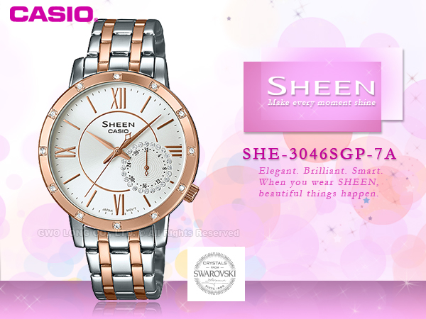 SHE-3046SGP-7A CASIO SHEEN 女錶 不鏽鋼錶帶 白面 礦物玻璃 防水 施華洛世奇