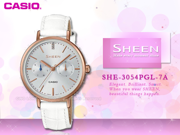 SHE-3054PGL-7A CASIO SHEEN 女錶 皮革錶帶 白面 礦物玻璃 施華洛世奇