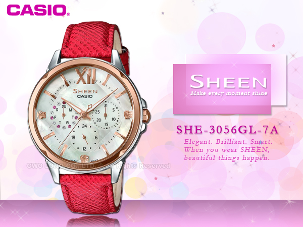 SHEEN以經典三針三眼設計推出全新型號SHE-3056GL/SHE-3056SG/SHE-3056D,便利顯示日期、星期與24小時制指針,全系列外觀上採用珍珠母貝錶盤及切割玻璃錶面設計,並綴上施華洛世奇水晶元素於九點中方向錶眼與整點時刻處;其中SHE-3056GL/SHE-3056SG的錶圈及立體整點時刻以玫瑰金離子IP 處理完成,錶帶選擇包含紅色真皮錶帶及不鏽鋼材質;而SHE-3056D整體為不鏽鋼材質製成,錶面共有典雅白與淡粉紅兩種選擇,完美打造迷人腕上風情。