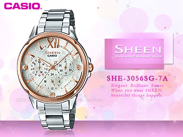 SHE-3056SG-7A CASIO SHEEN 女錶 不鏽鋼錶帶 施華洛世奇 防水 珍珠母貝錶盤
