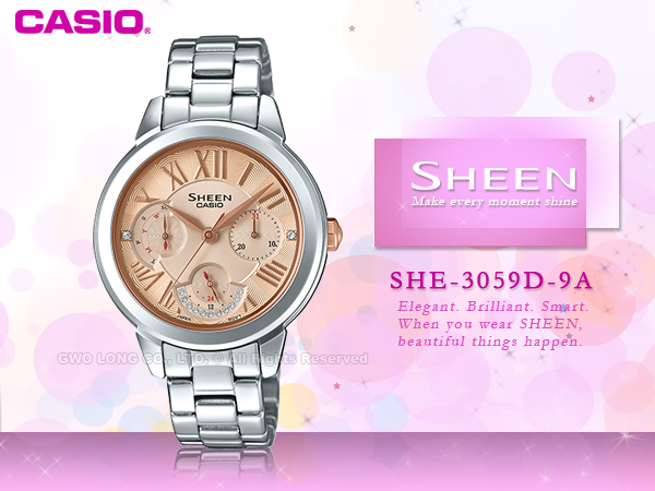 SHE-3059D-9A CASIO SHEEN 女錶 不鏽鋼錶帶 防水 施華洛世奇