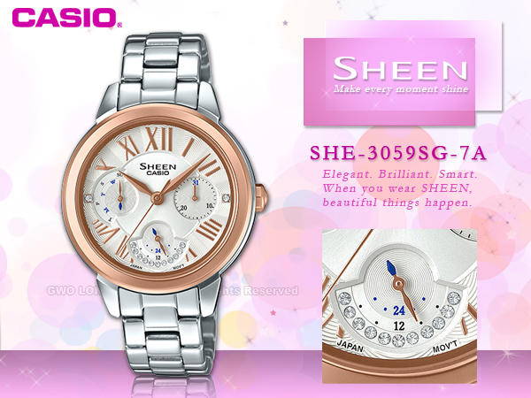 SHE-3059SG-7A CASIO SHEEN 女錶 不鏽鋼錶帶 銀 防水50米 施華洛世奇