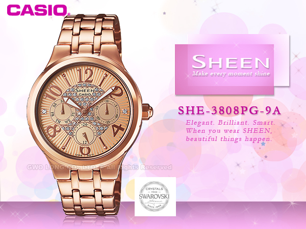SHE-3808PG-9A CASIO SHEEN 女錶 不鏽鋼錶帶 玫瑰金 防水 施華洛世奇